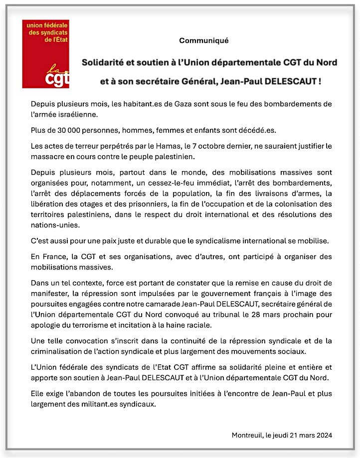 Le 20 octobre 2023 le secrétaire général de l’union départementale des syndicats CGT du Nord a été arrêté chez lui, placé en garde à vue et conduit au commissariat de Lille où il a été informé de sa mise en cause pour « apologie du terrorisme » et « incitation à la haine raciale ».