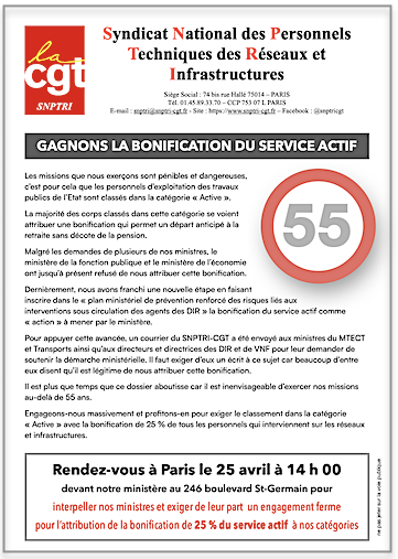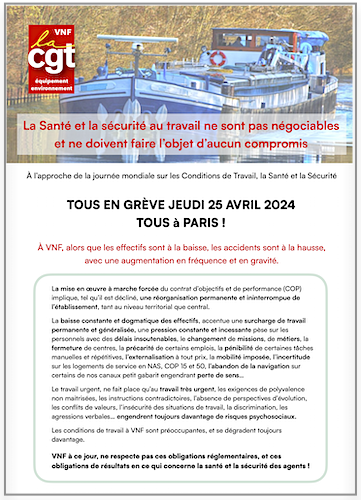 Ci-joint : appel, affiches, tracts FNEE CGT, Collectif Femme Mixité, OFICT, CGT VNF, SNOPA, SNPTRI, et visuels pour pancartes revendicatives en vue de la manifestation à Paris le 25 avril 2024.