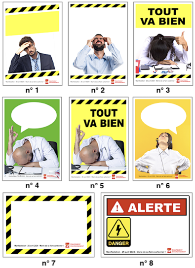 Aperçu des visuels ci-contre à télécharger : fichiers PDF joints au format A3, avec ou sans texte pour écrire vos slogans, à imprimer en A3 ou A4 pour vos pancartes (à plastifier si possible : adhésif couverture livre transparent)