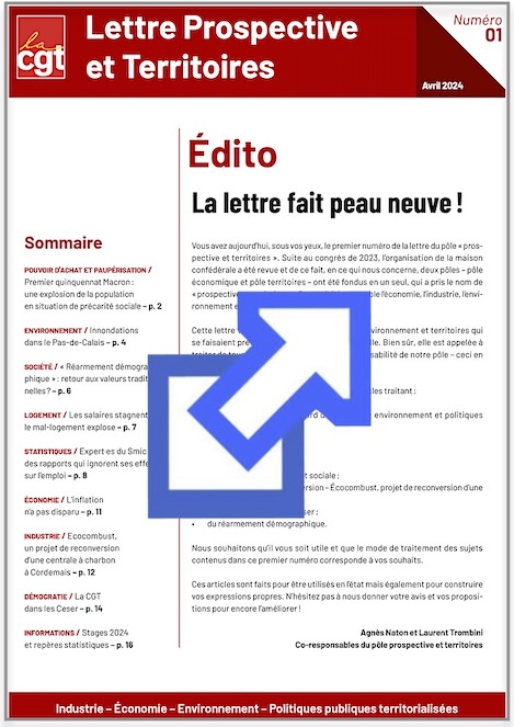 Nous vous invitons à lire la « Lettre Prospective et Territoires » de la CGT du mois d’avril 2024 ci-jointe. Elle apporte notamment des éléments d’analyse CGT sur l’actualité économique et environnementale.