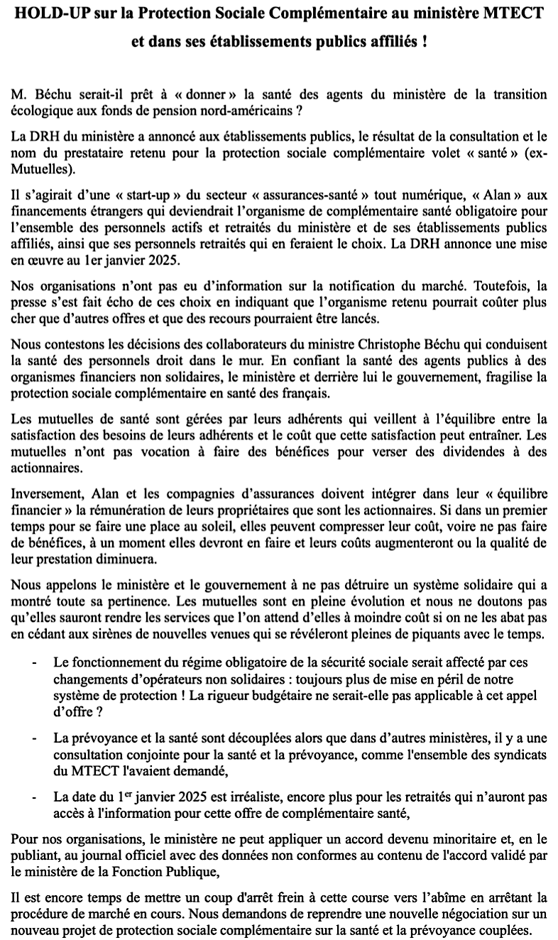 « (...) Nous demandons que le ministère de la Transition Ecologique suspende en urgence son marché de protection sociale complémentaire en santé, et prenne le temps de consulter, avec le ministère de la Fonction publique, les fédérations syndicales concernées sur les meilleures conditions possibles d’une mise en œuvre de la PSC obligatoire dans ce ministère.