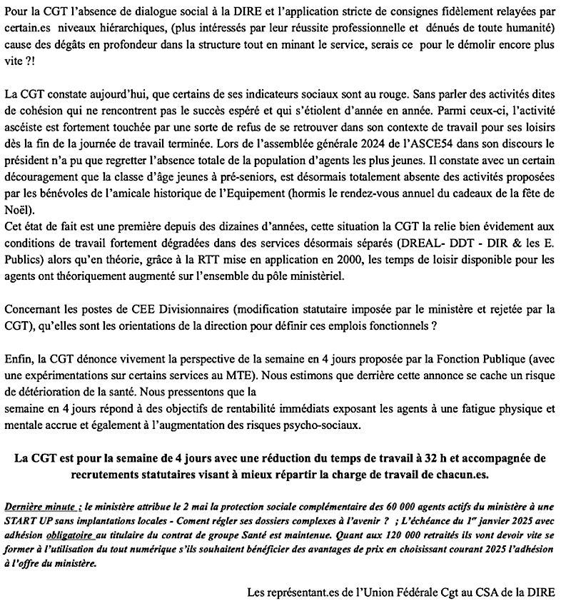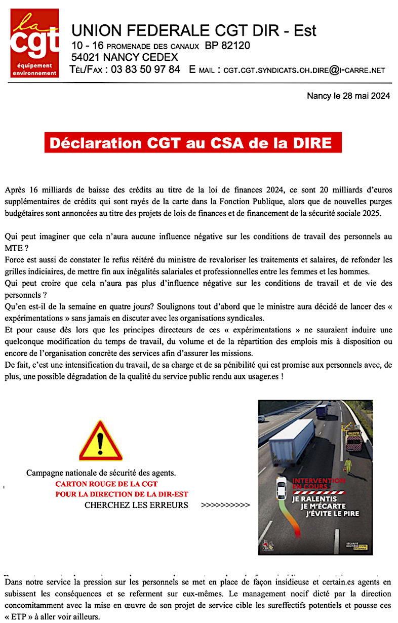 Ci-joint la déclaration CGT lue avant la réunion du Comité Social d’Administration de la DIR-Est, explicitant les raisons pour lesquelles les représentant.es de l’Union Fédérale CGT n’ont pas voulu siéger, malgré le nombre impressionnant de points prévus et présentés pour une mise au vote. (RAPPEL : le CSA n’a qu’un avis consultatif).