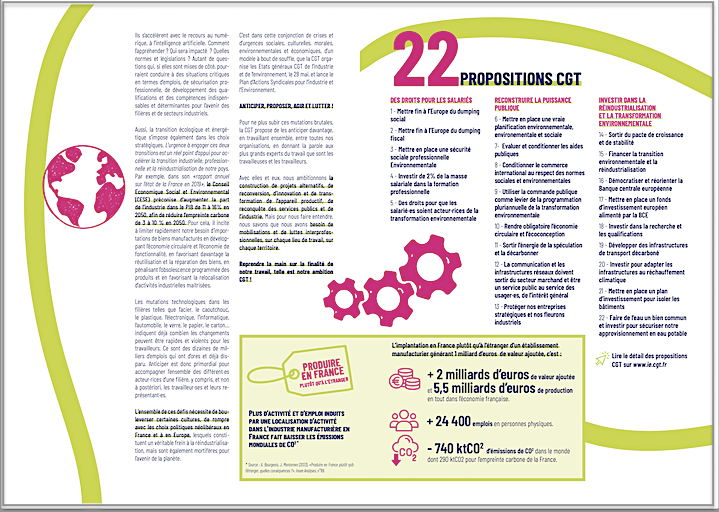 Les 22 propositions de la CGT, pour faire face aux enjeux industriels et environnementaux : https://ie.cgt.fr/proposition/