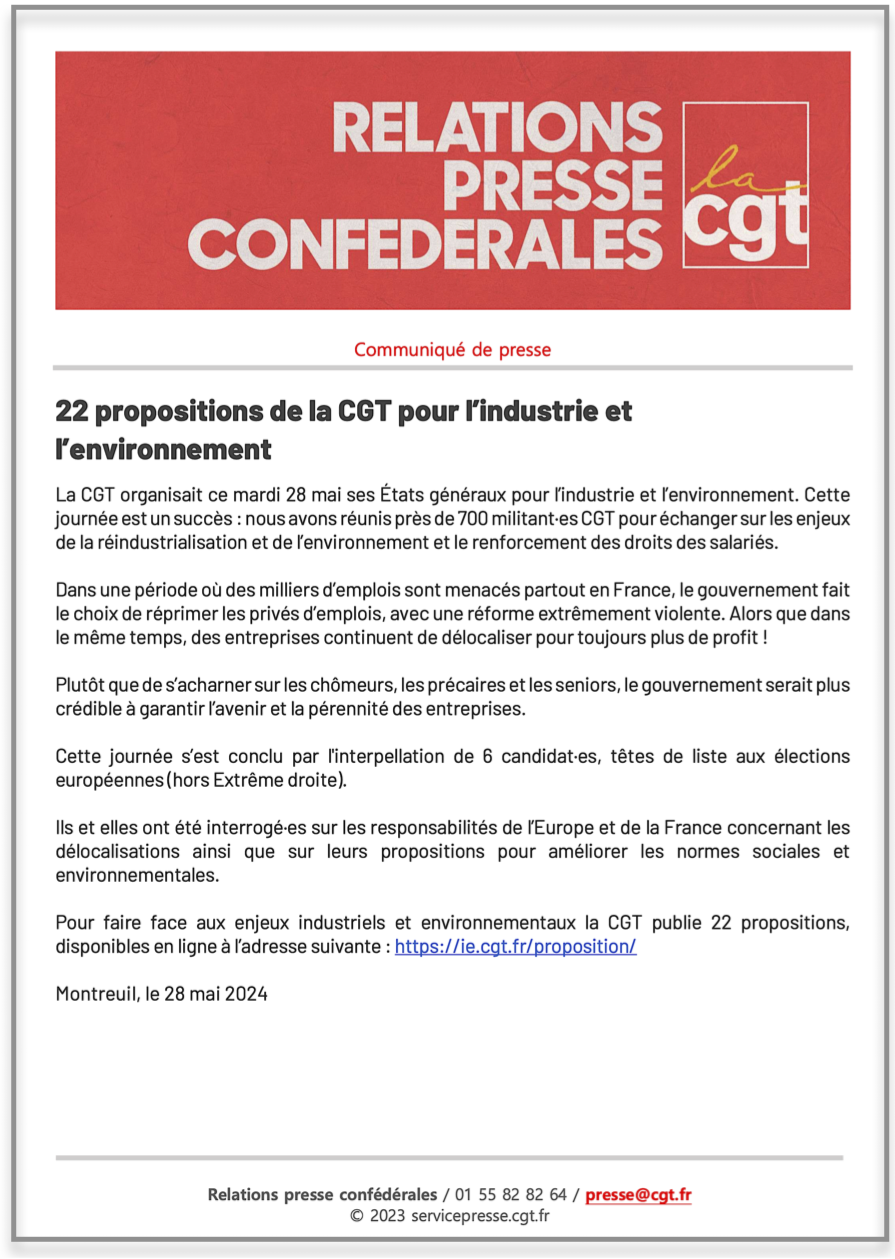 le Communiqué CGT « 22 propositions de la CGT pour l’industrie et l’environnement »