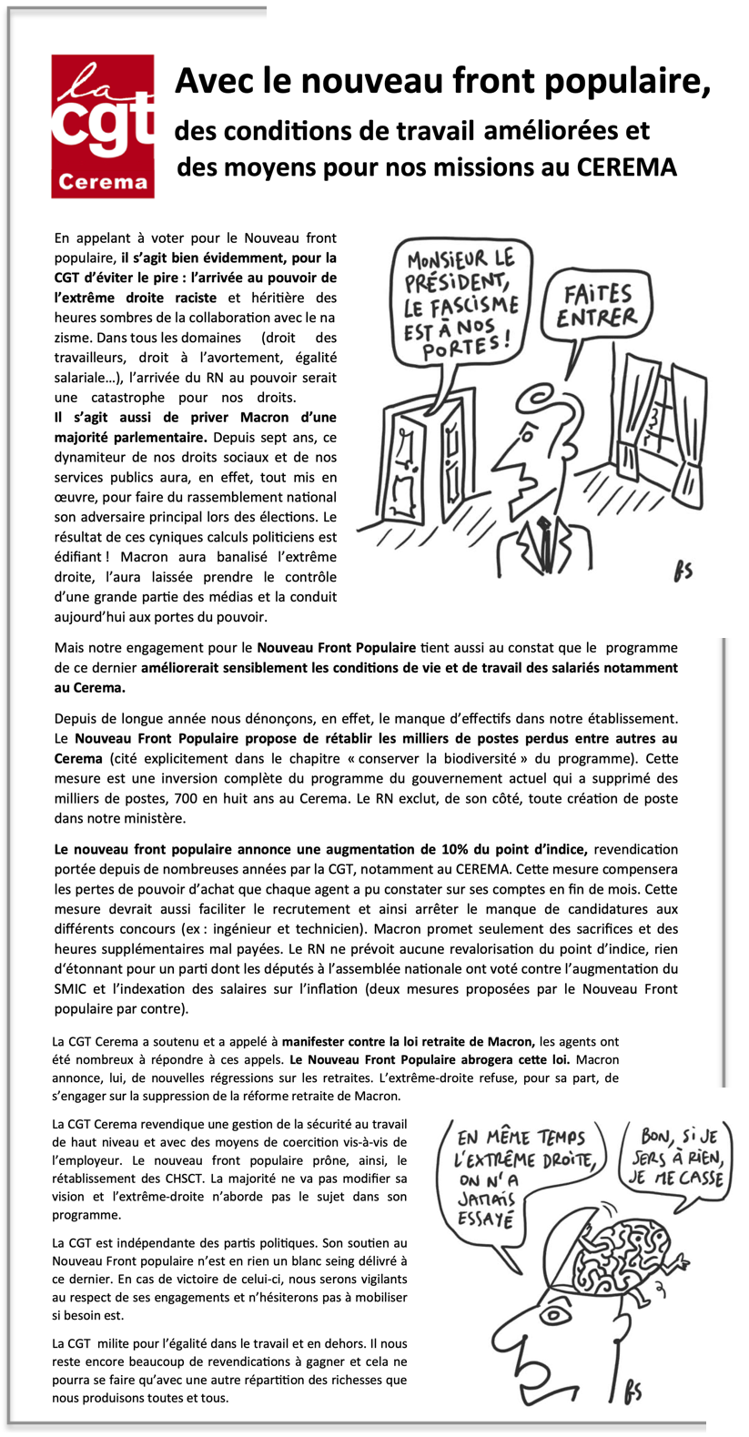 Vous trouverez ci-joint le tract réalisé par la CGT Cerema « Avec le nouveau front populaire, des conditions de travail améliorées et des moyens pour nos missions au CEREMA ».