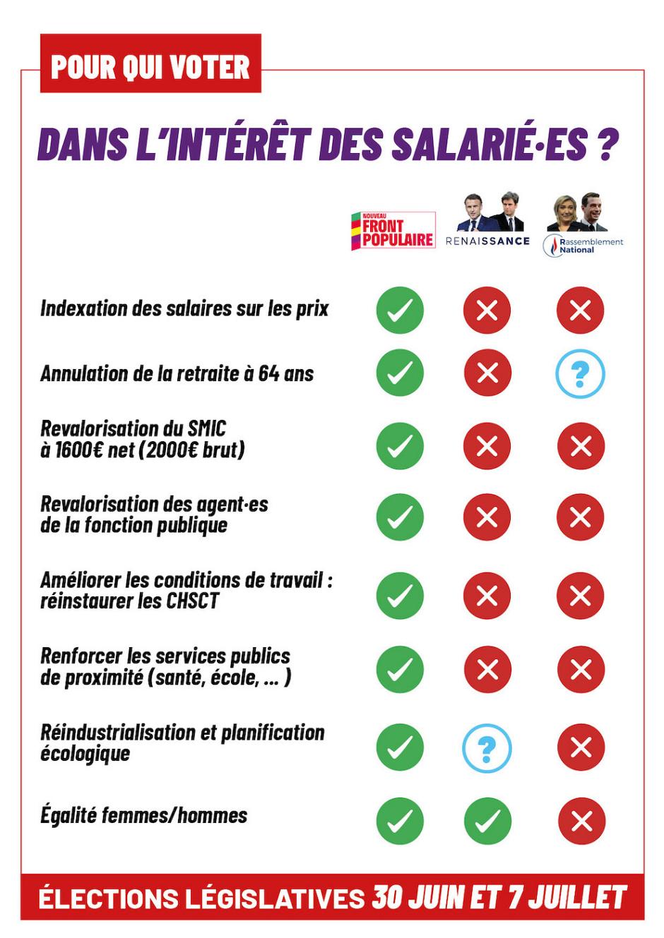 Vous trouverez ci-joint le Tract CGT « Jeudi 27 juin, au travail et dans la rue mettons partout la pression populaire ! », avec au verso, un comparatif de plusieurs points des programmes du nouveau Front populaire, de Renaissance et du RN :