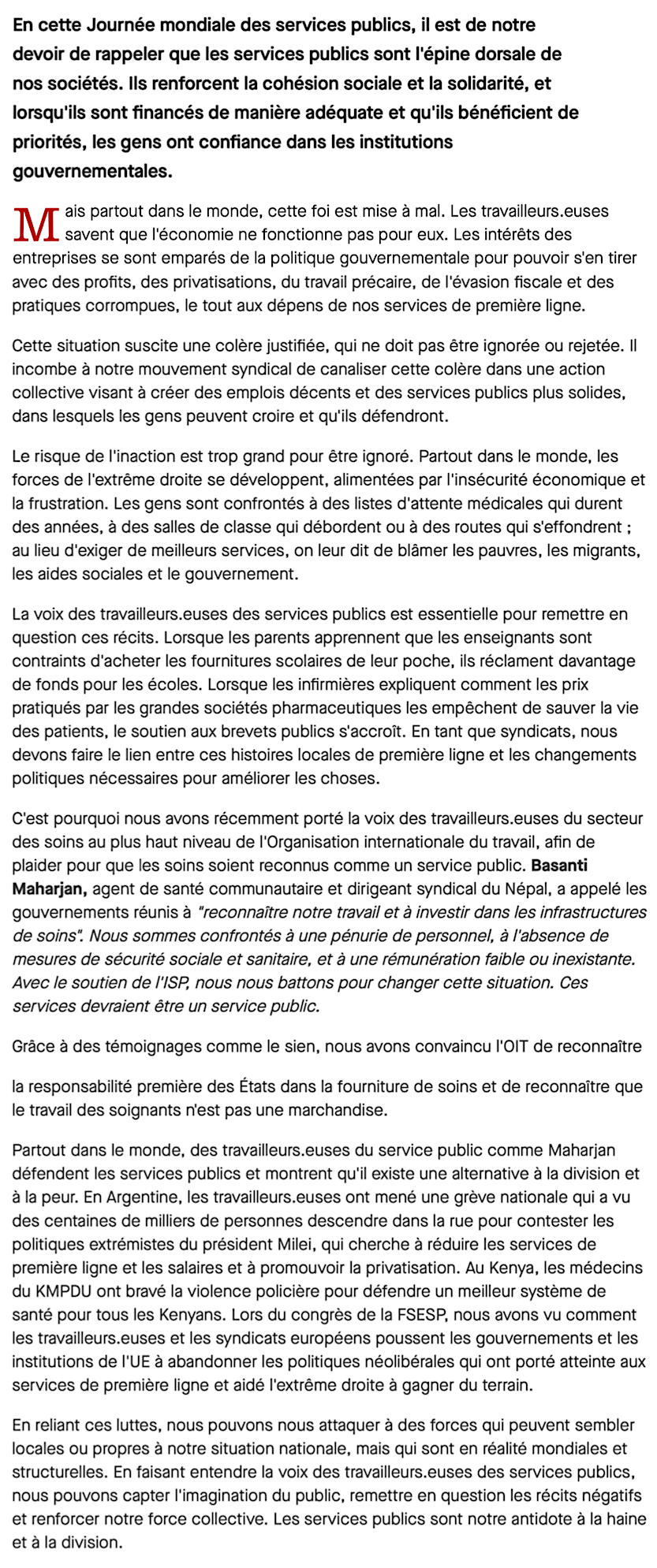 NOTA : L’ISP est une fédération syndicale mondiale regroupant plus de 700 syndicats dans 154 pays et représentant 30 millions de travailleurs. Elle fait entendre sa voix auprès de l’ONU, de l’OIT, de l’OMS et autres organisations régionales ou mondiales. L’ISP défend les droits des syndicats et des travailleurs et lutte pour l’accès universel à des services publics de qualité. Elle agit pour la construction d’une force syndicale mondiale du secteur public pour faire progresser les droits et les intérêts des travailleurs et promouvoir des services publics de qualité, essentiels à la mise en place d’un système équitable. En savoir plus