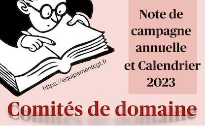 Note de la campagne annuelle des Comités de domaine et Calendrier 2023 des réunions des comités. Pour la CGT, les comités de domaine devraient être légitiment étendus à d’autres fonctions qui requièrent également de la technicité et de l’expertise : fonctions support, (…)